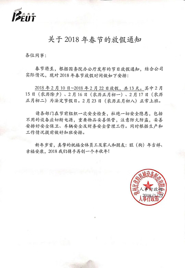 閱讀次數:3014【中國機床商務網欄目 名企在線】神犬續天雞,九州吟雪尤吟歲;新春臨大節,萬眾拜年喜迎新。金雞司晨去歲已逝,忠犬守夜喜迎新年。值此普天同慶、萬眾共賀之際,常州比優特機械設備制造有限公司(以下簡稱“常州比優特”)攜全體員工祝愿機床行業辛勤工作的全體同仁、給予了比優特巨大支持的新老用戶以及合作伙伴在新的一年里一帆風順、萬事如意、闔家團圓、幸福美滿。
